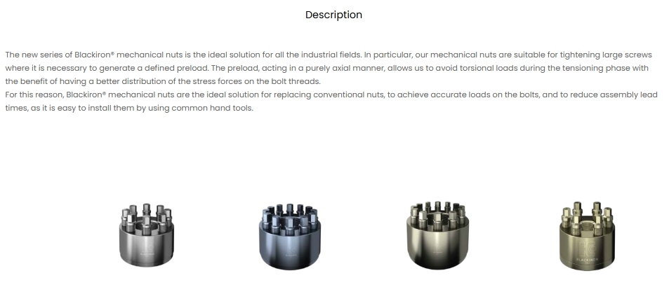 Blackiron mechanical nuts are versatile and resistant and following the highest manufacturing standards. They allow to tension the bolts without the use of pressurized hydraulic oil. By tightening the jackbolts at a predefined force it will be possible to apply a residual load to the bolt itself. Available up to 6100 kN nom. preload, can be designed in special material upon request.