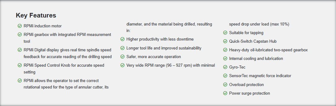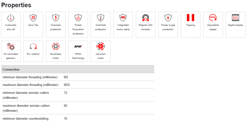 Magnetic drilling machine, annular cutters max. dia 60 millimeter, power supply tension 220 - 240 Volt, power supply frequency 50 - 60 Hertz, rotation direction bidirectional. RPMi Technology.