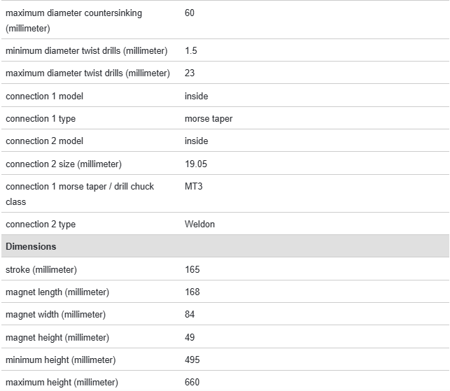 Magnetic drilling machine, annular cutters max. dia 100 millimeter, power supply tension 220 - 240 Volt, power supply frequency 50 - 60 Hertz, rotation direction bidirectional.