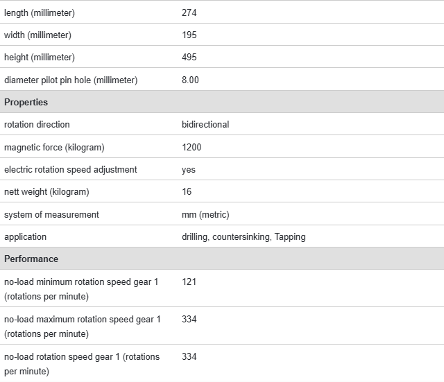 Magnetic drilling machine, annular cutters max. dia 200 millimeter, power supply tension 220 - 240 Volt, power supply frequency 50 - 60 Hertz, rotation direction bidirectional.